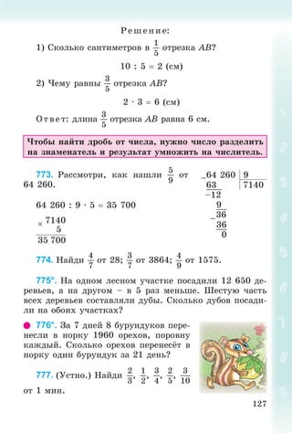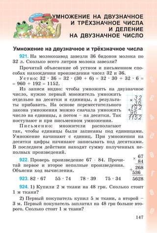 è ïðîøёë 603 êì. Íà ñêîëüêî ÷àñîâ äîëüøå áûë â äîðîãå âòîðîé ïîåçä, ÷åì ïåðâûé? 981. Ïðî÷èòàé çàäà÷ó, åё ðåøåíèå è îáúÿñíåíèå. Çàä à÷ à. Ïëîòíèê ðàñïèëèë äîñêó íà äâå ÷àñòè. Äëèíà îäíîé ÷àñòè 2 ì 30 ñì, à äðóãîé – 2 ì 60 ñì. Êàêîé áûëà áû äëèíà êàæäîé ÷àñòè, åñëè áû äîñêó ðàñïèëèëè íà äâå ðàâíûå ÷àñòè? Ð åø åíèå: 1) 2 ì 30 ñì + 2 ì 60 ñì 4 ì 90 ñì; 2) 4 ì 90 ñì : 2 2 ì 45 ñì. Î á ú ÿñ íåí èå. Äëèíà 2 ì 45 ñì – ñðåäíÿÿ äëÿ äî- ñîê äëèíîé 2 ì 30 ñì è 2 ì 60 ñì. 982. Ó÷åíèê òðèæäû èçìåðÿë ðàññòîÿíèå îò äîìà äî øêîëû. Ïåðâûé ðàç îí íàñ÷èòàë 207 øàãîâ, âòîðîé – 195 è òðåòèé – 204 øàãà. Ñêîëüêî â ñðåäíåì øàãîâ äî øêîëû? 983. Ñ 1 3 ãà ëèïîâîé ïîñàäêè ïîëó÷èëè 220 êã ìёäà. Ñêîëüêî êèëîãðàììîâ ìёäà ïîëó÷àò ñ 3 4 ãà ëèïîâîé ïî- ñàäêè? 984*. Ïðîâåðü, ìîãóò ëè ïðîèçâåäåíèÿ íåêîòîðûõ äâóõ ÷èñåë ñîäåðæàòü òå æå öèôðû, ÷òî è ìíîæèòåëè: 27 · 81 2187; 35 · 41 1435. 985°. 402 : 67 305 : 43 2 êì : 400 ì 511 : 73 529 : 85 8 ì 4 äì · 5 5 ò – 5 êã 3 ö – 3 êã 986°. Áðèãàäà ïî íîðìå äîëæíà áûëà ðåìîíòèðîâàòü a ìàøèí â äåíü. Íî îíà ðåìîíòèðîâàëà íà k ìàøèí áîëüøå. Ñêîëüêî ìàøèí áðèãàäà îòðåìîíòèðîâàëà çà 5 äíåé? Ñîñòàâü âûðàæåíèå. 987. Ðàññìîòðè çàïèñü è ïðî÷èòàé îáúÿñ- íåíèå. Îá úÿ ñ íåí èå. Äåëèìîå 452, äåëèòåëü 14.  ÷àñòíîì áóäåò 2 öèôðû. Ðàçäåëèì 45 –452 14 42 32 –32 28 4
