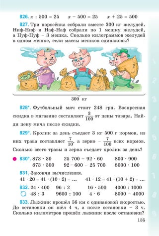 ñî ñêîðîñòüþ 15 êì/÷. Íà ñêîëü- êî åìó íàäî óâåëè÷èòü ñêîðîñòü, ÷òîáû íà êàæäîì êè- ëîìåòðå âûèãðûâàòü ïî 1 ìèí? 966°. 1240 · 24 907 · 28 – 18000 : 2 938 : 67 1240 · 324 (907 · 28 – 18 000) : 2 714 : 7 967°.  2 îäèíàêîâûõ ìåøêàõ çåðíà íà 4 ö 20 êã ìåíüøå, ÷åì â 7 òàêèõ æå ìåøêàõ. Êàêîâà ìàññà çåð- íà â ýòèõ 7 ìåøêàõ? 968. (Óñòíî.) 200 : 200 200 : 1 500 · 2 : 4 60 · 0 · 1 500 : 5 500 : 100 0 : 500 2800 : 40 969. Ñðàâíè çàïèñè ïèñüìåííîãî íàõîæäåíèÿ ÷èñëî- âûõ çíà÷åíèé ïðîèçâåäåíèé 1578 · 43 è 1578 · 403. 1578 1578 43 403 + 4734 + 4734 6312 6312 67854 635934 970. 1243 · 207 4054 · 104 2517 · 305 420 · 607 971. Ñàìîëёòó íóæíî áûëî ïðîëåòåòü 4500 êì. Ïåð- âûå 3 ÷ îí ëåòåë ñî ñêîðîñòüþ 695 êì/÷, à ñëåäóþ- ùèå 2 ÷ – ñî ñêîðîñòüþ 642 êì/÷. Ñêîëüêî êèëîìåòðîâ îñòàëîñü ïðîëåòåòü ñàìîëёòó? 972. Äëèíà îäíîãî ïðÿìîóãîëüíîãî ó÷àñòêà 120 ì, øèðèíà 46 ì. Íàéäè øèðèíó äðóãîãî ïðÿìîóãîëüíîãî ó÷àñòêà ñ òàêîé æå ïëîùàäüþ, äëèíà êîòîðîãî 80 ì. 973. Âåëîñèïåäèñò çà 3 ÷ ïðîåõàë 36 êì. Íà îáðàòíîì ïóòè åãî ñêîðîñòü áûëà íà 3 êì/÷ ìåíüøå. Ñêîëüêî âðå- ìåíè ïîòðàòèë âåëîñèïåäèñò íà îáðàòíûé ïóòü? 974*. Íàéäè íàèáîëüøåå è íàèìåíüøåå çíà÷åíèÿ x, ÷òîáû íåðàâåíñòâà áûëè èñòèííûìè. 240 x < 35 ∙ 10 560 : 70 < x 240 – 70