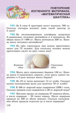 ñ îáúÿñíåíèåì: 12 168 : 52. 1006. 3612 : 84 13 902 : 42 3772 : 82 14 147 : 43 1007. 1932 ò ùåáíÿ ïåðåâåçëè ñåìüþ ñàìîñâàëàìè ãðóçîïîäúёìíîñòüþ 12 ò êàæäûé. Ñêîëüêî âñåãî ðåé- ñîâ ñäåëàëè ñàìîñâàëû, åñëè êîëè÷åñòâî ðåéñîâ êàæäî- ãî îäèíàêîâî? (Ðåøè çàäà÷ó äâóìÿ ñïîñîáàìè.) 1008. Ñ 25 ãà ñîáðàëè ïî 24 ö ðæè ñ ãåêòàðà, à ñ 15 ãà – ïî 32 ö ñ ãåêòàðà. Íàéäè ñðåäíþþ óðîæàé- íîñòü ðæè íà ýòèõ ó÷àñòêàõ. 1009. Êàêîâî íàèáîëüøåå çíà÷åíèå ïåðåìåííîé x, ïðè êîòîðîì íåðàâåíñòâî 200 – x > 42 èñòèííî? 1010*. Åñòü òðè ïðÿìîóãîëüíèêà. Äëèíà è øèðèíà ïåðâîãî 5 ñì è 3 ñì, âòîðîãî – 5 ñì è 4 ñì, òðåòüåãî – 7 ñì è 2 ñì. Ìîæíî ëè èç íèõ ñëîæèòü êâàäðàò? 1011°. Ñ ïåðâîãî ó÷àñòêà ñîáðàëè 42 ìåøêà ëóêà, à ñî âòîðîãî – 29. Ñî âòîðîãî ó÷àñòêà ñîáðàëè íà 715 êã ëóêà ìåíüøå, ÷åì ñ ïåðâîãî. Ñêîëüêî êèëîãðàììîâ ëóêà ñîáðàëè ñ êàæäîãî ó÷àñòêà? 1012°.4505 : 85 162 · 67 3 ì : 25 ñì 10 ò – 10 êã 5418 : 43 407 · 89 2 ò : 25 êã 10 ì – 10 ñì 1013. (Óñòíî.)48 : (48 : 4 + 4) 36 · 20 640 : 80 : 2 48 : (48 : 8) 25 · 60 640 : (80 : 2) 1014. Íàéäè ñðåäíåå àðèôìåòè÷åñêîå ÷èñåë 28, 30, 32, 44 è 26. 1015. Ðàññìîòðè ðèñóíîê è îòâåòü íà âîïðîñû. Êàêèå ÷èñëà áóäóò íà ñòîëáå, óäàëёííîì îò èçîáðà- æёííîãî â ñòîðîíó Õàðüêîâà íà 34 êì? Êàêîå ñâîéñòâî ñóììû ìû çäåñü íàáëþäàåì?