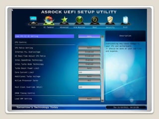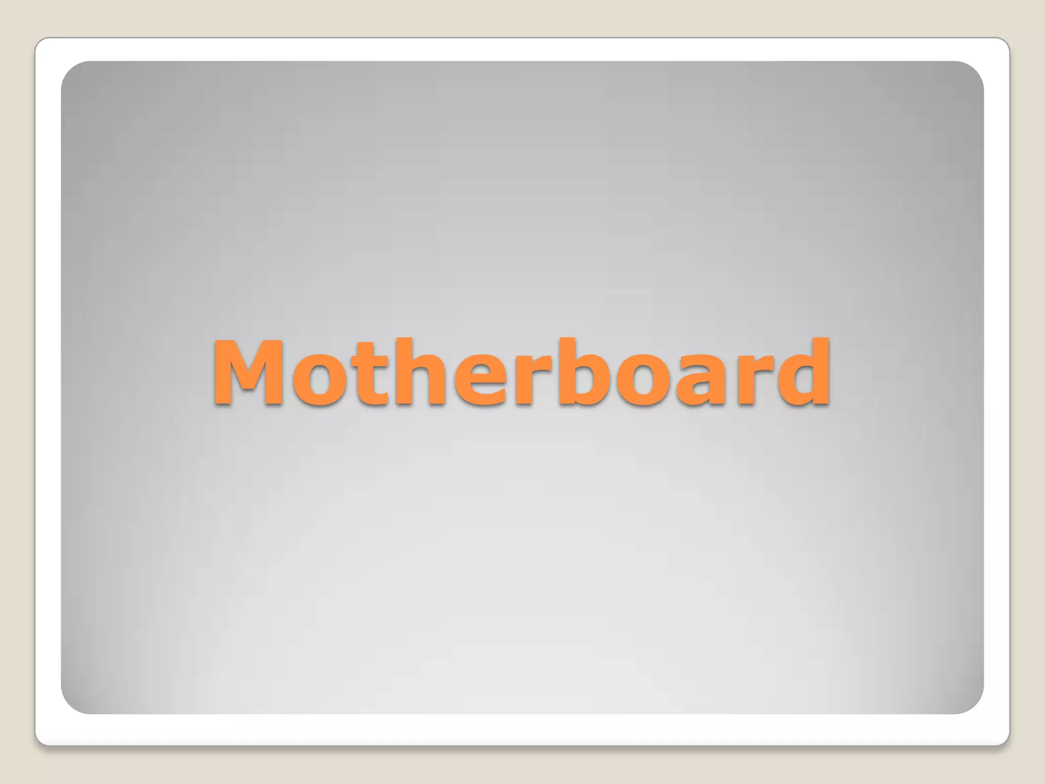The motherboard is the main circuit board in a computer that holds and connects all the components. It contains the CPU and RAM sockets and connects them via the front-side bus or directly. Other components like graphics cards connect via expansion slots. The chipset, which may include a northbridge and southbridge, controls data flow between components. The BIOS stored on the motherboard controls startup and interfaces with components. Newer motherboards use the UEFI firmware instead of BIOS. Form factor, CPU socket, RAM type and expansion slots determine what components a motherboard supports.