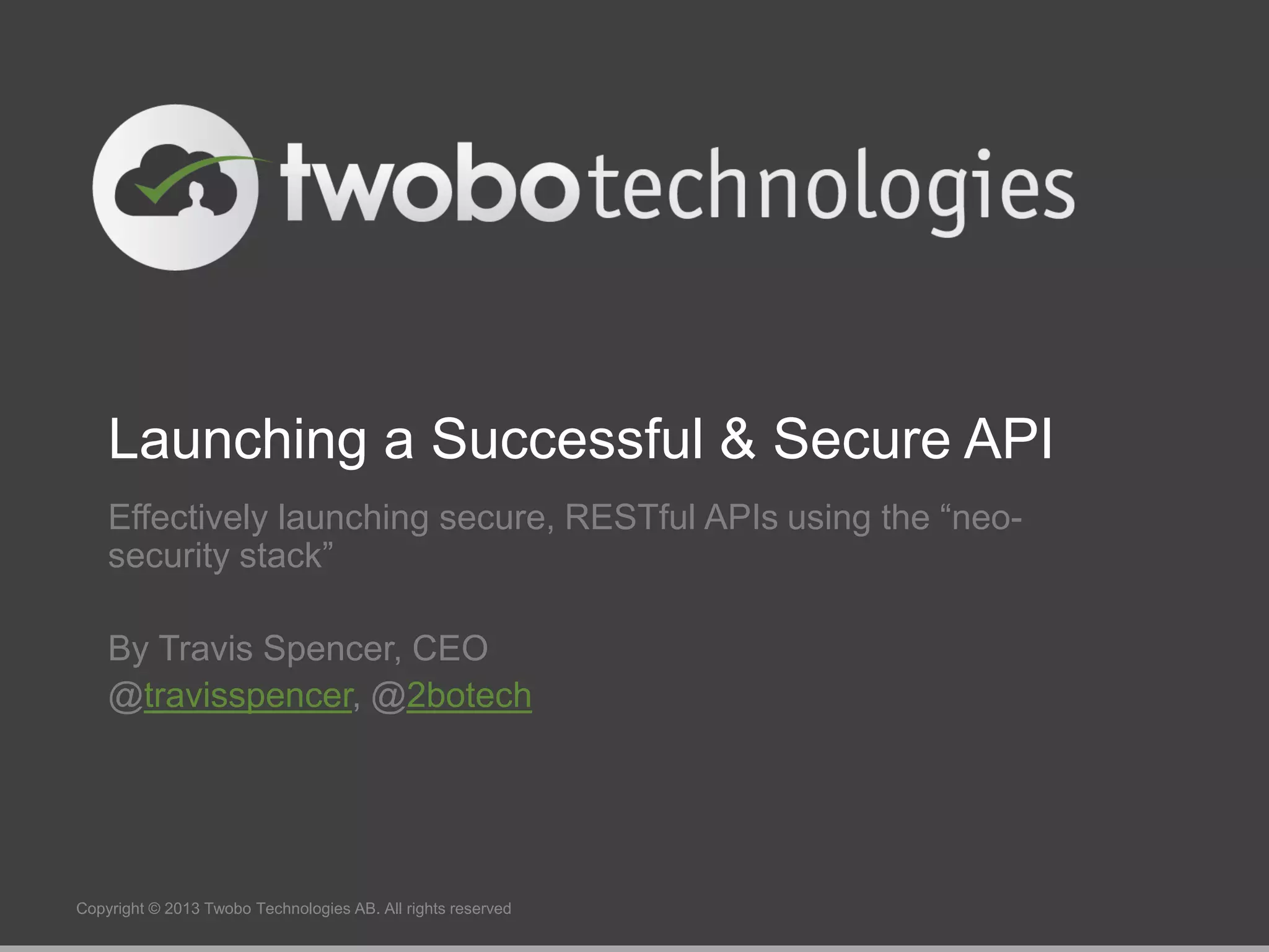 The document outlines the effective launch of secure, RESTful APIs using the 'neo-security stack', discussing disruptive trends like cloud computing and social networks. It provides examples of successful API implementations from companies such as Pearson, Salesforce, and AT&T, highlighting benefits such as new revenue streams and innovation. Critical components like OAuth, SAML, and OpenID Connect are explored for managing identity and authorization within API ecosystems.