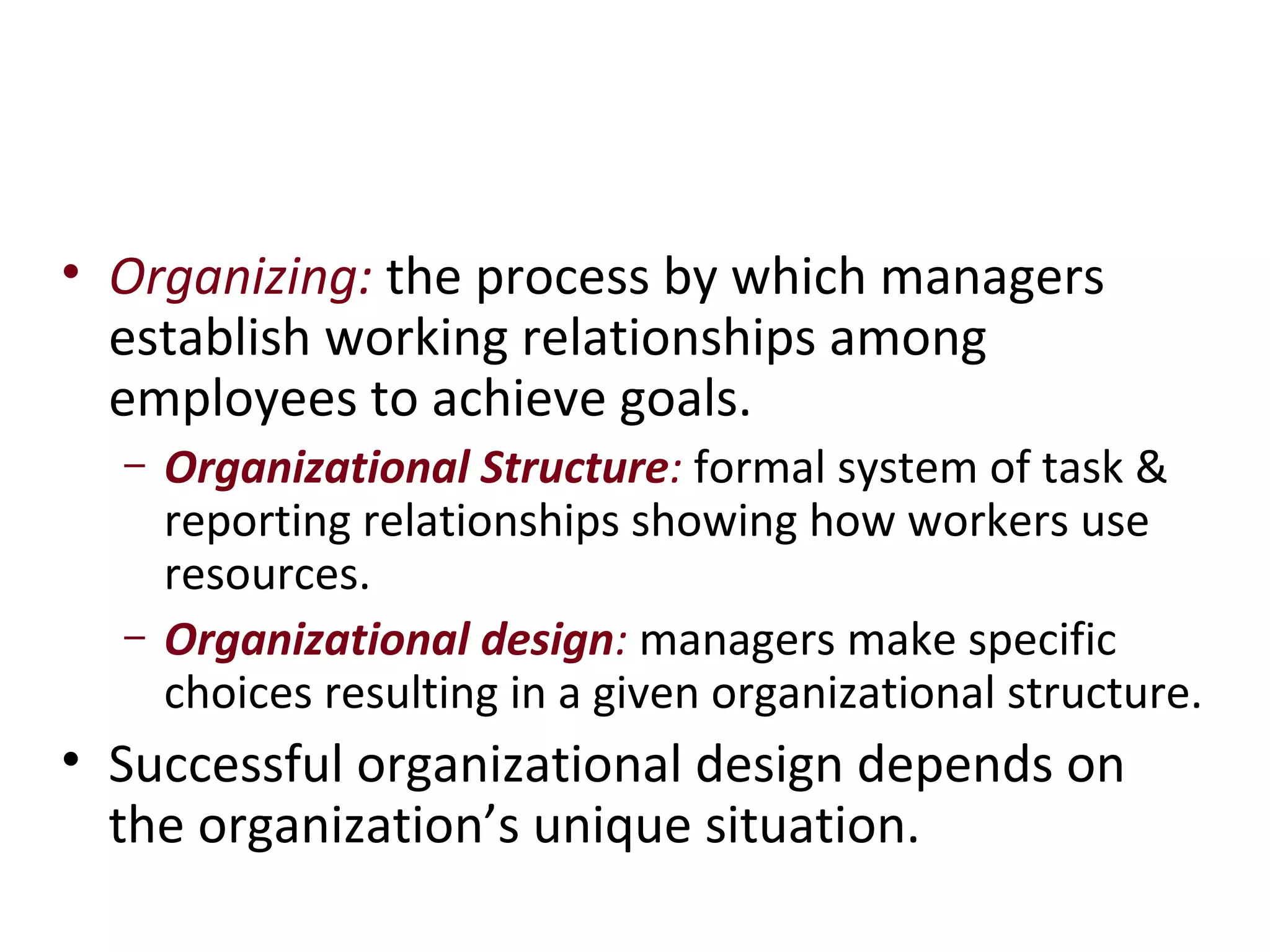The document discusses various factors that influence organizational structure such as environment, strategy, technology, and human resources. It also examines different types of organizational structures including functional, divisional, matrix, and network structures. The goal of organizational design is to establish relationships between employees that allow the organization to achieve its objectives.