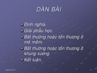 This document appears to be a presentation in Vietnamese on chest wall abnormalities seen on radiography. It begins with an introduction defining chest wall deformity and noting that it is commonly overlooked. Each following section then discusses and provides examples of various chest wall abnormalities that could be seen on x-ray, including increased or decreased density of the ribs, abnormalities of the costal cartilage, bony abnormalities of the ribs, and breast implants. Images are included with explanations to demonstrate different pathologies. The presentation concludes by emphasizing the importance of recognizing these chest wall deformities on radiography.