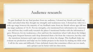 1) The document summarizes the student's film project where they created a promotional video about their city. They received feedback from friends and family, who said the voiceover was informative but some transitions were distracting.