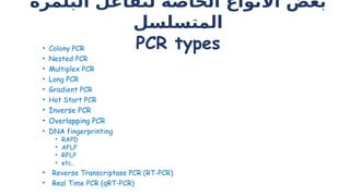The document outlines various PCR (Polymerase Chain Reaction) types and their applications in molecular genetics, including colony, nested, multiplex, and long PCR. It also discusses techniques for DNA fingerprinting, such as RAPD and AFLP, as well as reverse transcriptase PCR (RT-PCR) for gene expression analysis and real-time PCR for monitoring reaction progress. Key concepts such as cycle threshold (Ct) values, fluorescence measurement, and melting curve analysis for product verification are also examined.