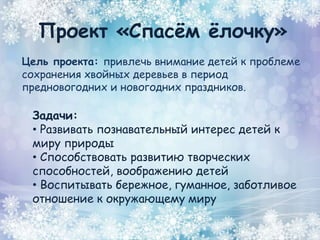 Документ описывает проекты для старшей группы «Ромашка» ГБОУ СОШ № 1985, направленные на воспитание заботы о природе и животных среди детей в Москве в 2015 году. Основные проекты включают мероприятия по сохранению хвойных деревьев и помощи зимующим птицам, с использованием различных форм активности, таких как занятия, мастер-классы и стенгазеты. Каждый проект акцентирует внимание на развивающих задачах и воспитании бережного отношения к окружающему миру.
