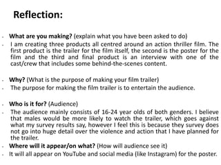 Spencer Fox is creating three pre-production documents for an action thriller film project: a trailer, poster, and behind-the-scenes interview. The documents outline the target 16-24 year old audience, filming locations on YouTube and social media, and two poster layout options. Spencer also includes production materials like equipment budgets, call sheets, and health and safety plans to prepare for the shoot.