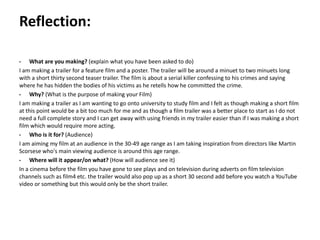 The document provides details about the pre-production process for a student film project. It includes a description of the film (a serial killer confessing crimes), the purpose of making a trailer rather than a full film, the target audience, and where the trailer will be viewed. It then provides a breakdown, script, storyboard, and shot list for the trailer. Finally, it discusses the style, resources, contingency planning, health and safety considerations, and a proposed production schedule.