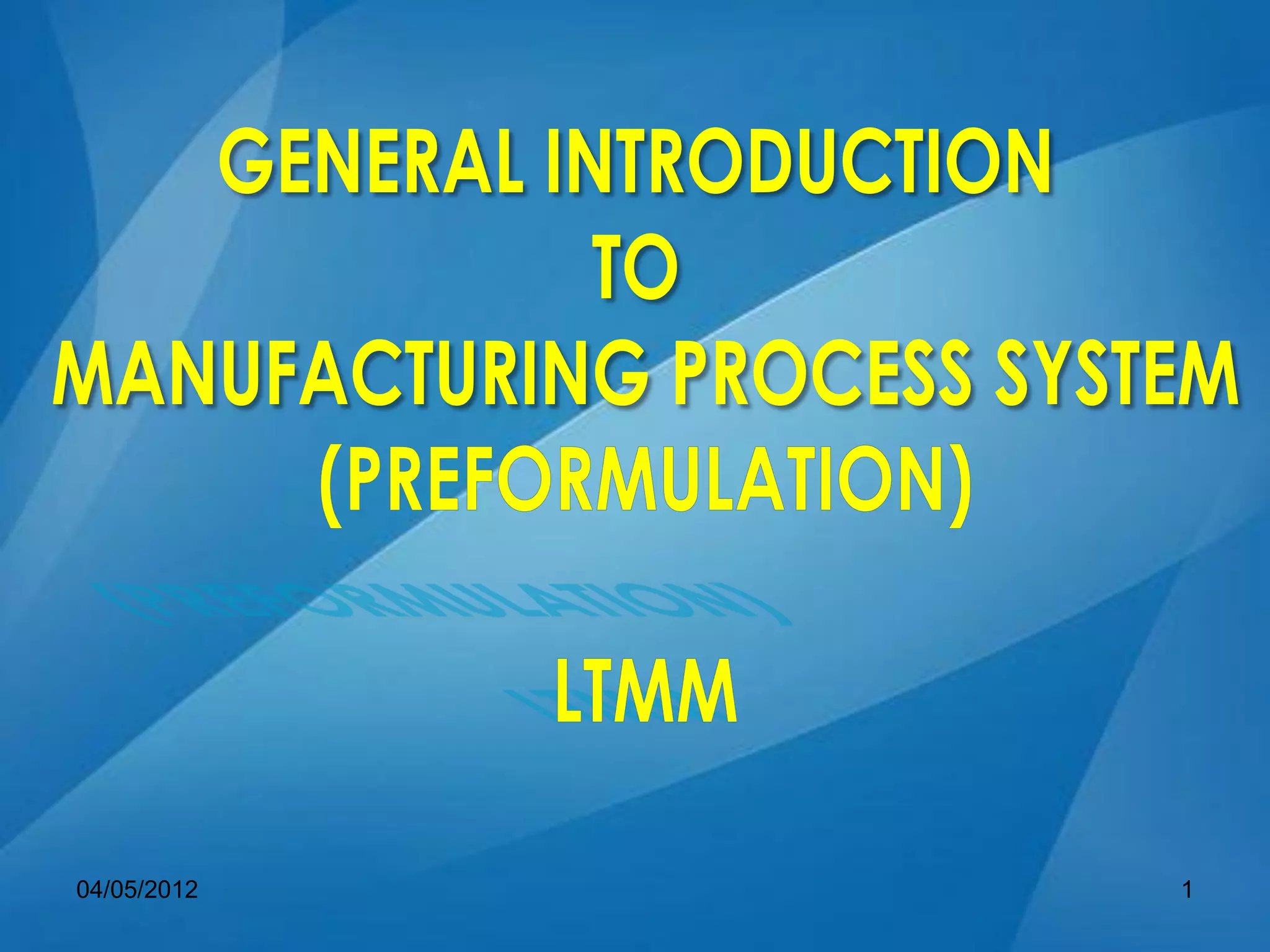 The document provides an outline for lectures on pharmaceutical dosage form processing. It will cover general introduction to manufacturing processes, formulation assessment, analytical method development, formulation development, good manufacturing practices, and drug product stability. Key aspects of preformulation are also summarized, including characterizing organoleptic properties, purity, particle size and shape, solubilization using surfactants, and preformulation stability studies. Manufacturing processes involve transforming raw materials into finished products through various treatment, machining, and reshaping steps while ensuring quality.