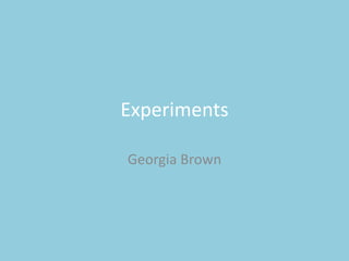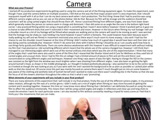 The document summarizes experiments the author conducted with camera angles, editing software, color correction, and sound editing. For the camera experiment, the author practiced different angles, handheld shots, and lighting. In the editing experiment, the author edited together various shots on Premier Pro and added transitions, titles, and color correction. For color, the author adjusted hues in Premier Pro to create different moods. In sound editing on Audition, the author adjusted volume, trimmed audio, and edited multiple tracks together. The author intends to apply techniques from these experiments, like varied angles, transitions, and subtle color/sound adjustments, to their final film project.