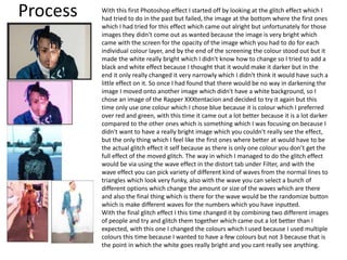 The document discusses various experiments the author has conducted with Photoshop effects and photo manipulation. It describes applying glitch, dispersion, and other effects to images, as well as combining multiple images. The author reflects on what techniques worked well and areas for improvement, such as using reflectors for better lighting. The experiments aimed to explore branding and logo designs for clothing by adding patterns and text to mock-up t-shirts in Photoshop.