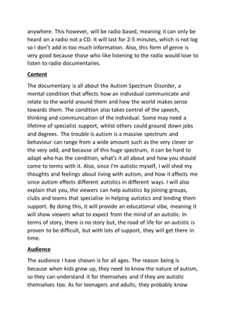 This document proposes an audio documentary titled "Living With Autism" that will educate listeners about autism spectrum disorder. The purpose is to teach about the aspects and signs of autism, how it affects communication and thinking, and how both autistic individuals and others can adapt to the condition. As an autistic person, the producer will share their personal experiences and perspective. The documentary will be 2-5 minutes, presented on the radio, and feature samples from autistic individuals to demonstrate what it's like to live with autism. It aims to simplify information for all ages and increase understanding of autism as a mental condition rather than illness that impacts people in different ways.
