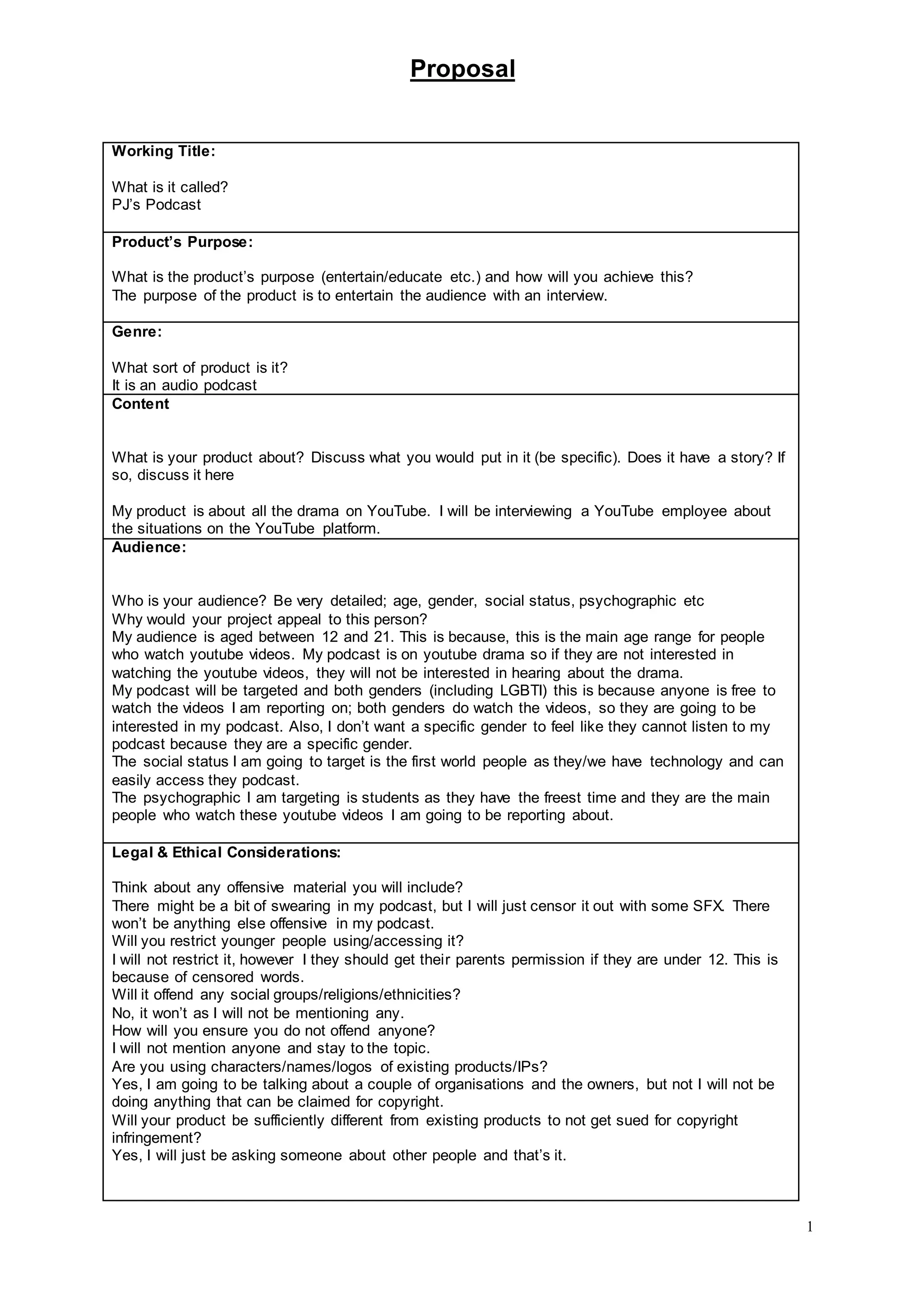 The podcast will be an audio interview discussing YouTube drama. It aims to entertain 12 to 21 year olds, both genders and students, who are interested in YouTube videos. The podcast may contain some censored swearing. While not restricting younger listeners, parental permission is recommended for under 12s. The topic will focus on the interview and avoid offending groups. Copyright will not be an issue as long as the content remains sufficiently different from existing works.
