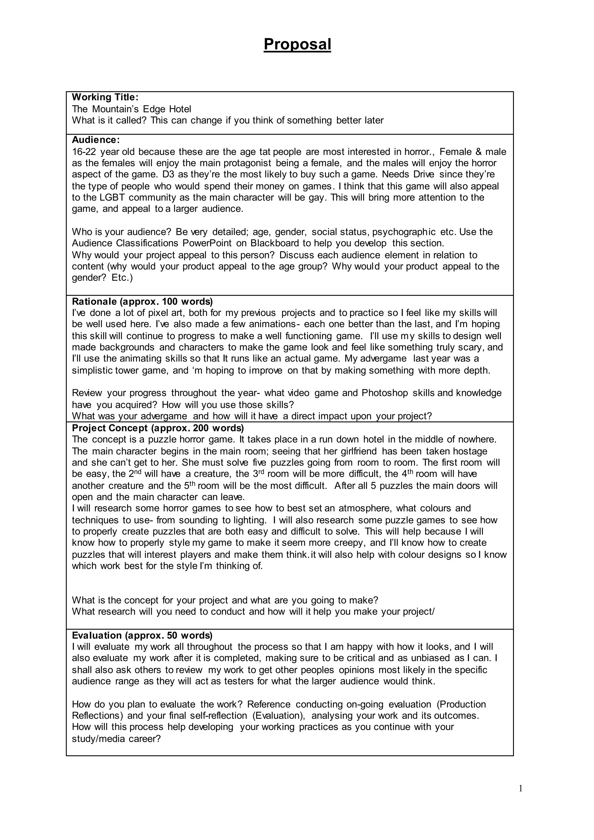 The project is a horror puzzle game called "The Mountain's Edge Hotel" aimed at 16-22 year olds of both genders. The main character is a female whose girlfriend has been taken hostage in the run-down hotel. To rescue her, the player must solve puzzles of increasing difficulty across 5 hotel rooms, encountering creatures along the way. The game will utilize the author's pixel art and animation skills developed through past projects and practice. Research into horror and puzzle game design will inform the atmosphere, puzzles, and mechanics. Evaluation will involve self-reflection, peer feedback, and testing with the target audience to improve the work and support future career development.
