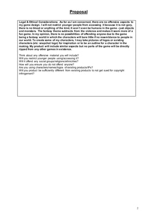 The document proposes an online flash game called "Warfare of Ages" that will entertain bored people. The game will be a scrolling defense strategy game set in a fantasy medieval world resembling our own, where the player builds an army to battle against enemies through different time periods. Key elements will include units from the stone age through medieval age that work in a "rock paper scissors" system. The target audience is teenage males interested in war and strategy games with open minds to fantasy. Research into similar defense games will inform the design and merged fanbases. No offensive content is anticipated as the game does not depict humans or blood, only fantasy objects and monsters, avoiding potential issues.