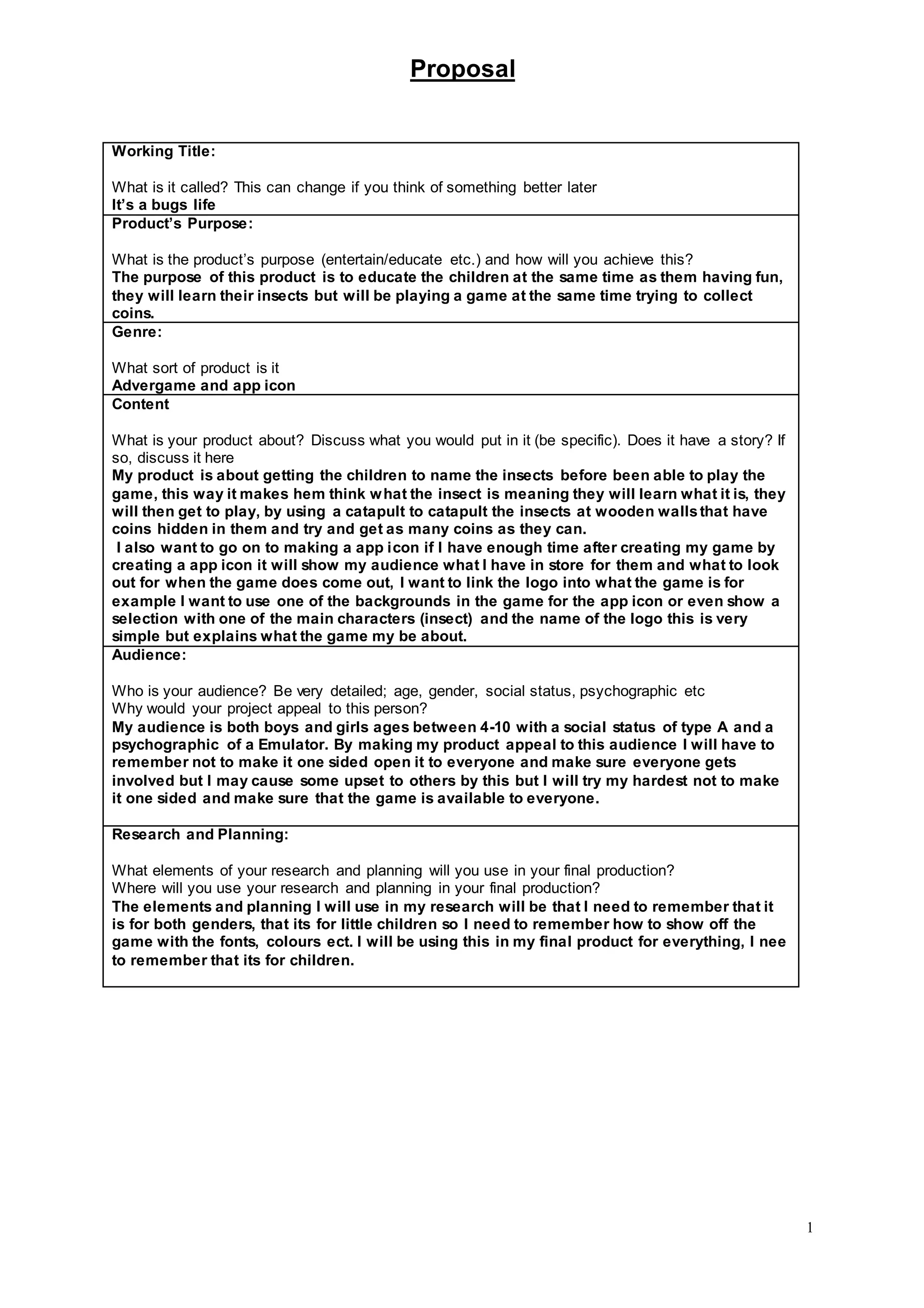 The proposal is for an educational game app called "It's a Bugs Life" that teaches children about insects. The game would have children name insects to play and use a catapult to launch insects at walls to collect coins. The target audience is boys and girls ages 4-10. Legal considerations include ensuring the game is inclusive for all, does not offend any groups, and avoids copyright infringement from similar existing products like Angry Birds. Research into appropriate fonts, colors and simplicity for young children will inform the final product design.