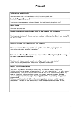 This proposal outlines a musical game that aims to entertain players of any age or gender. The game will use sound to allow players to hear the song they are playing. It will incorporate a point scoring system and contain no offensive material. The game is targeted towards ages 7+ for safety and will not intentionally offend any social groups. All content will be original creations to avoid copyright issues.