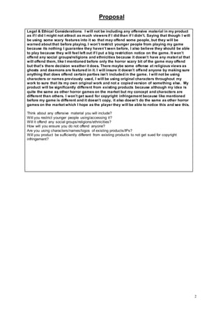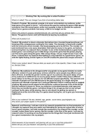 My product is a horror game called Perdition that aims to scare and entertain audiences through its spooky and low-budget atmosphere. The game follows a character exploring a haunted house where he encounters a monster trying to kill him. I will include creepy lighting effects and details for the player to find. My audience is of all ages and genders since the content is only scary, not offensive. I will incorporate elements from my research like including a monster since they are fundamental to horror games. I will not include offensive material that could limit viewers. While it may scare some, younger players will not be restricted. Original characters and concepts will be used to avoid copyright issues.