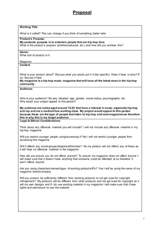 This proposal outlines a hip-hop music magazine targeted at males aged 15-25 who enjoy hip-hop music. The magazine will provide the latest news and content from the hip-hop community. To ensure the magazine does not offend anyone, it will avoid offensive material and ensure all content has permission to use any existing intellectual property or copyrighted material. The goal is to entertain hip-hop fans without restricting access or offending social groups.