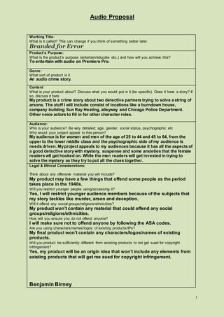 This audio proposal outlines a crime story podcast called "Branded for Error" that will entertain audiences ages 25-64. It follows two detective partners trying to solve a string of arsons in various Chicago locations. The podcast aims to hook female listeners with mystery and suspense, and engage male listeners through solving clues. While set in the 1940s, the creator will take care not to offend any groups through sensitive topics or adherence to advertising standards codes. The original story and characters aim to avoid copyright issues.