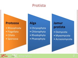 Dokumen ini membahas tentang klasifikasi dan karakteristik protista, termasuk protozoa, alga, dan jamur, serta cara reproduksinya. Protista dikelompokkan berdasarkan morfologi dan alat geraknya, dengan contoh spesifik dari masing-masing kelompok. Informasi terperinci diberikan mengenai setiap filum, termasuk Chrysophyta, Chlorophyta, dan oomycota.