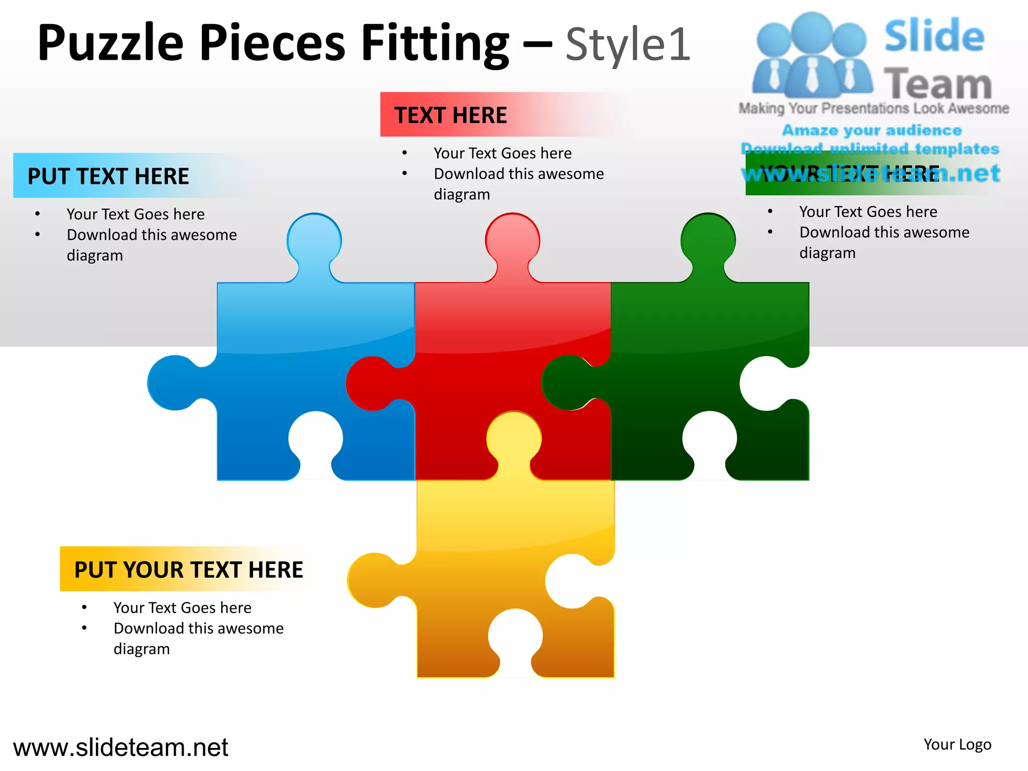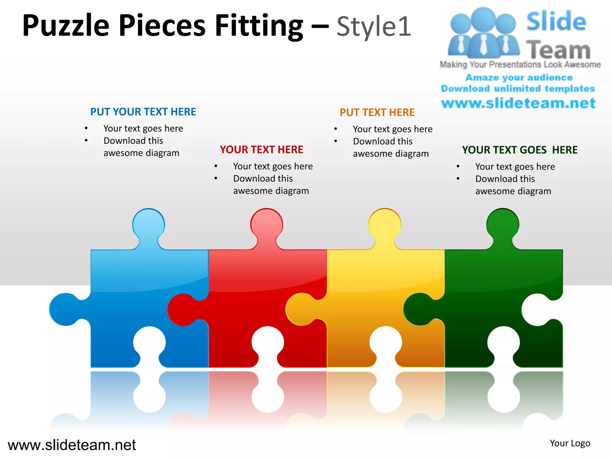 The document is a template for puzzle piece diagrams that can be customized with text. It contains instructions for editing the color, size, and orientation of individual puzzle pieces. The template includes multiple layout options and suggests bringing presentations to life by capturing the audience's attention. All images are fully editable in PowerPoint.