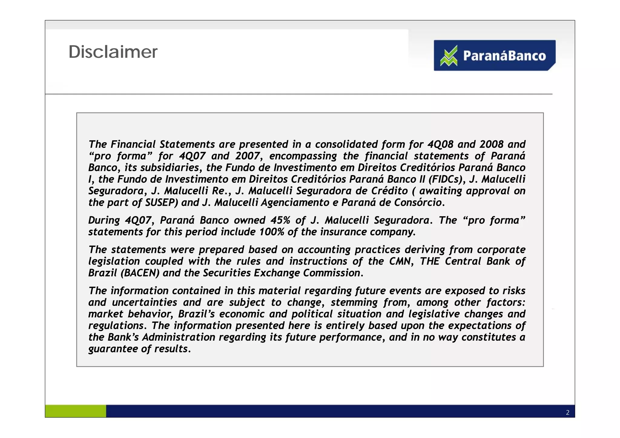 Paraná Banco reported its financial results for 4Q08 and full year 2008. Key highlights include: