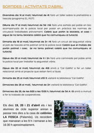 Dilluns dia 17 al matí, l'alumnat de 5è i 6è farà una sortida pel poble en bici