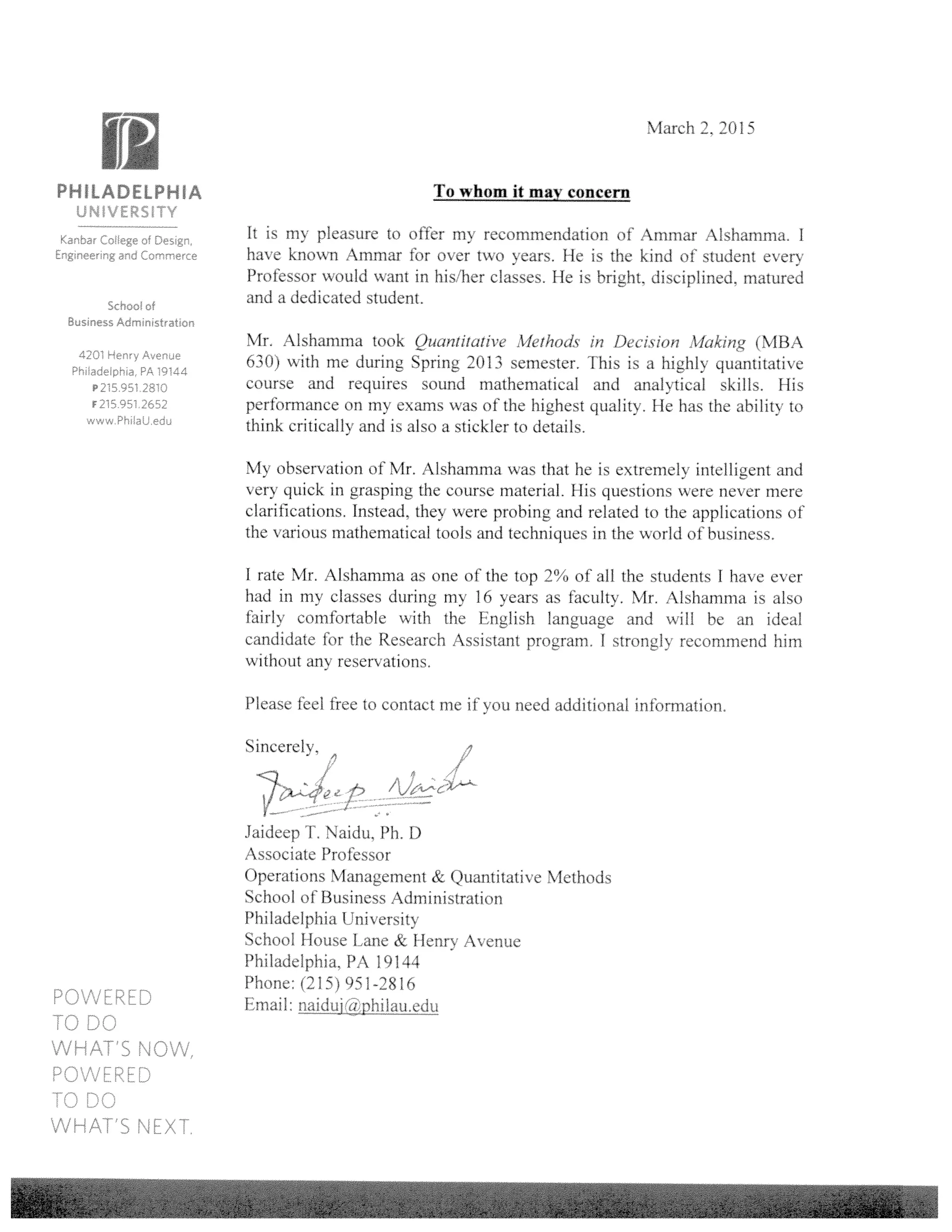 This memorandum recommends Mr. Ammar Al-Shamma for a position. The writer, D.K. Malhotra, was Ammar's advisor in the MBA program and taught him in several finance courses requiring strong quantitative, analytical, and computing skills. Ammar performed exceptionally well academically and showed remarkable maturity, a unique problem-solving perspective, and a willingness to take different approaches. He was also a strong team player. The writer is certain Ammar would be an asset as an intelligent, self-motivated, hard-working, and easy to work with problem solver with excellent presentation skills. A second recommendation notes that Ammar was always eager to help his classmates and has an