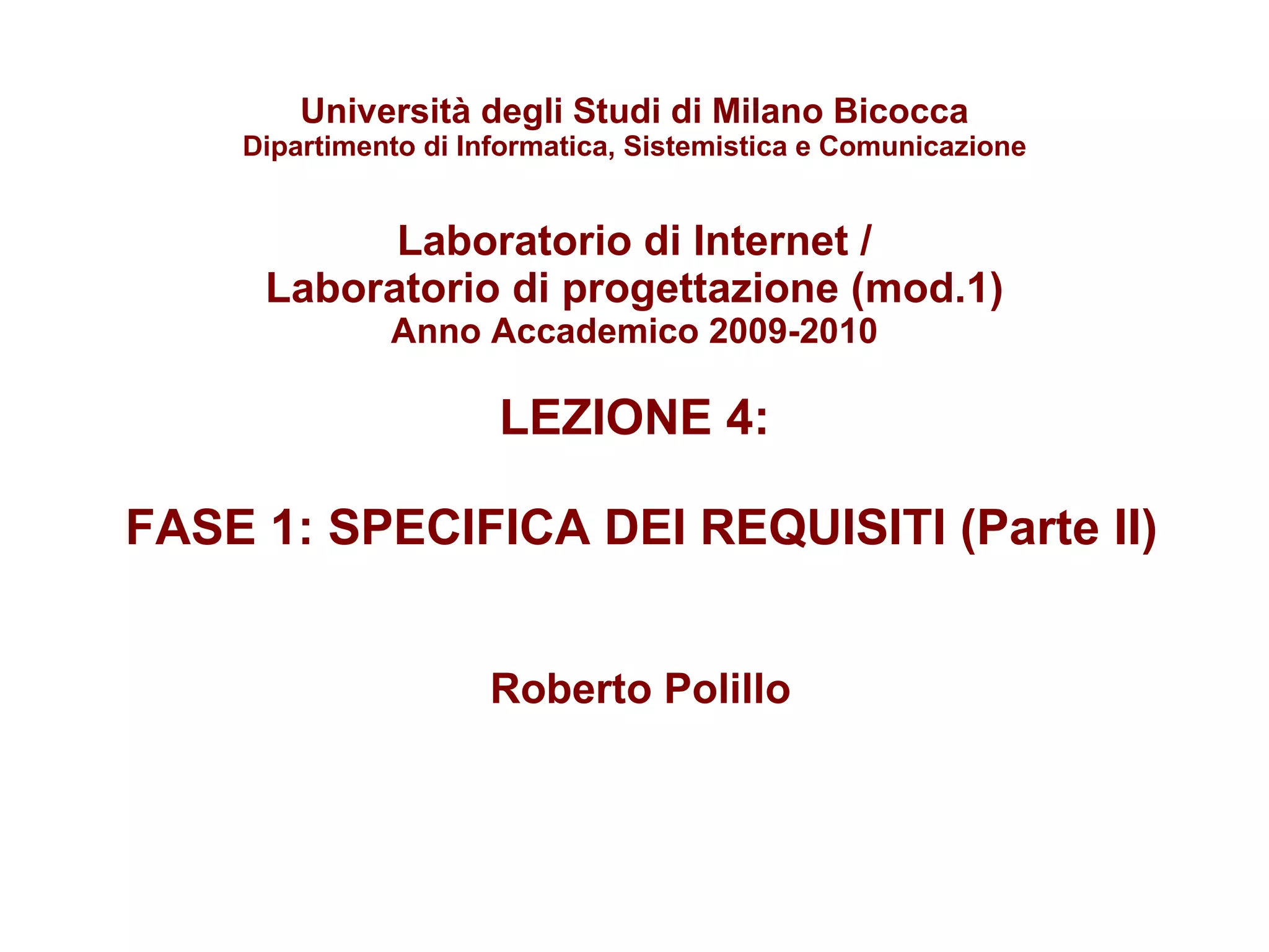 Il documento fornisce linee guida per la fase di specifica dei requisiti nel contesto del web design, suddiviso in vari capitoli riguardanti architettura, comunicazione, funzionalità, contenuti e gestione. Vengono esplorati vari aspetti come la struttura di navigazione, l'accessibilità, la sicurezza e le modalità di gestione dei contenuti informativi. Un'attenzione particolare è rivolta a identificare le relazioni tra gli utenti e le funzionalità del sito, insieme a esempi pratici e modelli da seguire.