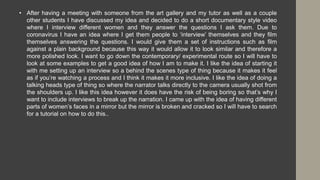 Grace Gilbert is planning a documentary style video interviewing different women about their experiences. Due to coronavirus, she has come up with the idea of having the women self-film their answers to questions. She wants the project to have a contemporary/experimental style and will look at examples to help develop her idea. Some ideas she is considering include starting with behind-the-scenes footage of an interview, using a "talking heads" format where women talk directly to the camera, and including different parts of women's faces in a broken mirror.