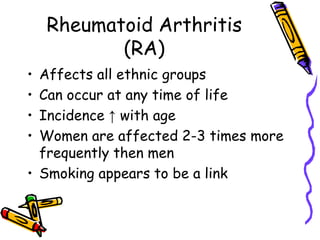 Rheumatoid arthritis is a chronic autoimmune disease characterized by inflammation of the synovial joints. It affects all ethnic groups and can occur at any time in life, though incidence increases with age and it is more common in women. While the specific cause is unknown, it is believed to involve an abnormal immune response triggered by an antigen that leads to the formation of autoantibodies and immune complexes that damage joints. Long-term inflammation and damage to joints can cause pain, stiffness, swelling, and deformities like subluxation. It may also affect other body systems.