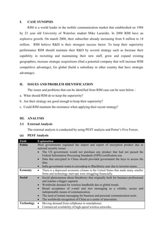 RIM is a world leader in mobile communications that established in 1984. By 2008, RIM experienced explosive growth, with subscribers increasing from 8 million to 14 million. To maintain its competitive advantage, RIM believes R&D is key and should pursue strategies like increasing recruiting, expanding geographies, strategic acquisitions, and going global. Issues include how to maintain superiority and if current strategies are sufficient. RIM conducts external and internal analyses to understand its environment and resources. Externally, factors like regulations, economics, technology and legal issues impact RIM. Internally, RIM focuses on R&D and its culture. RIM forms alliances to capture new insights and experiences to increase its R&D capabilities