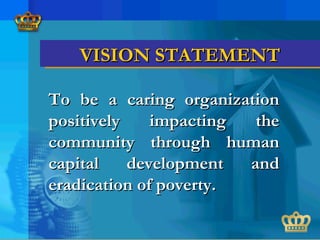 The Relief Organization of Crown Knights (R.O.C.K.) is a proposed foundation aimed at addressing socio-economic challenges and enhancing the livelihoods of communities through various programs such as emergency relief, economic opportunities, and training initiatives. Its mission includes fostering self-help capacity and providing infrastructural support, while operating as a not-for-profit organization dedicated to charitable efforts. R.O.C.K. also plans to develop investment funds and training programs to empower individuals and promote sustainable economic development.