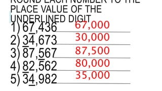TO THE PLACE VALUE OF THE UNDERLINED DIGIT 1) 67,436 2) 34,673 3) 87,567 4) 82,562 5) 34,982 67,000 30,000 87,500 80,000 35,000