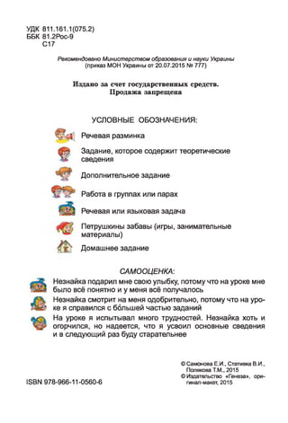 Документ представляет собой учебник для четвероклассников, подготовленный авторами самоновой, стативки и поляковой, который фокусируется на изучении русского языка и культуры. Он включает в себя задания на развитие речевых навыков, работу в группах, а также домашние задания и самооценку. Главная цель учебника - подготовка учащихся к дальнейшему обучению, развитие грамотности и уверенности в собственных силах.