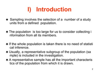 This document discusses different sampling methods used in research. It begins by defining key sampling terms like population, sample, sampling unit, and sampling frame. It then describes the main types of probability sampling methods including simple random sampling, systematic random sampling, stratified random sampling, cluster sampling, and multi-stage sampling. The document also discusses non-probability sampling methods and notes that while quicker and cheaper, they do not allow for generalization. Overall, the document provides an overview of different sampling strategies, their advantages and disadvantages, and examples of how each might be implemented in research.