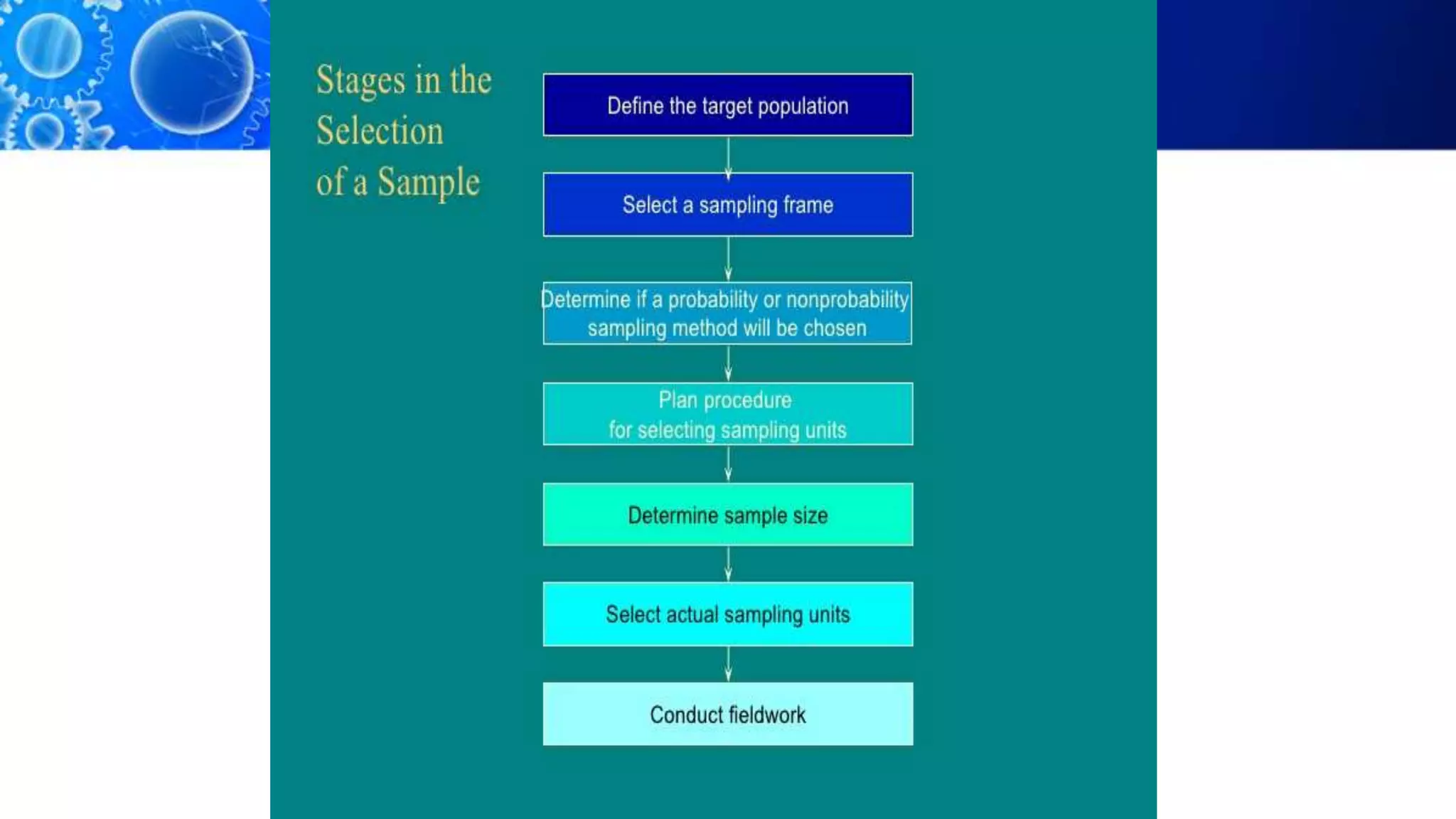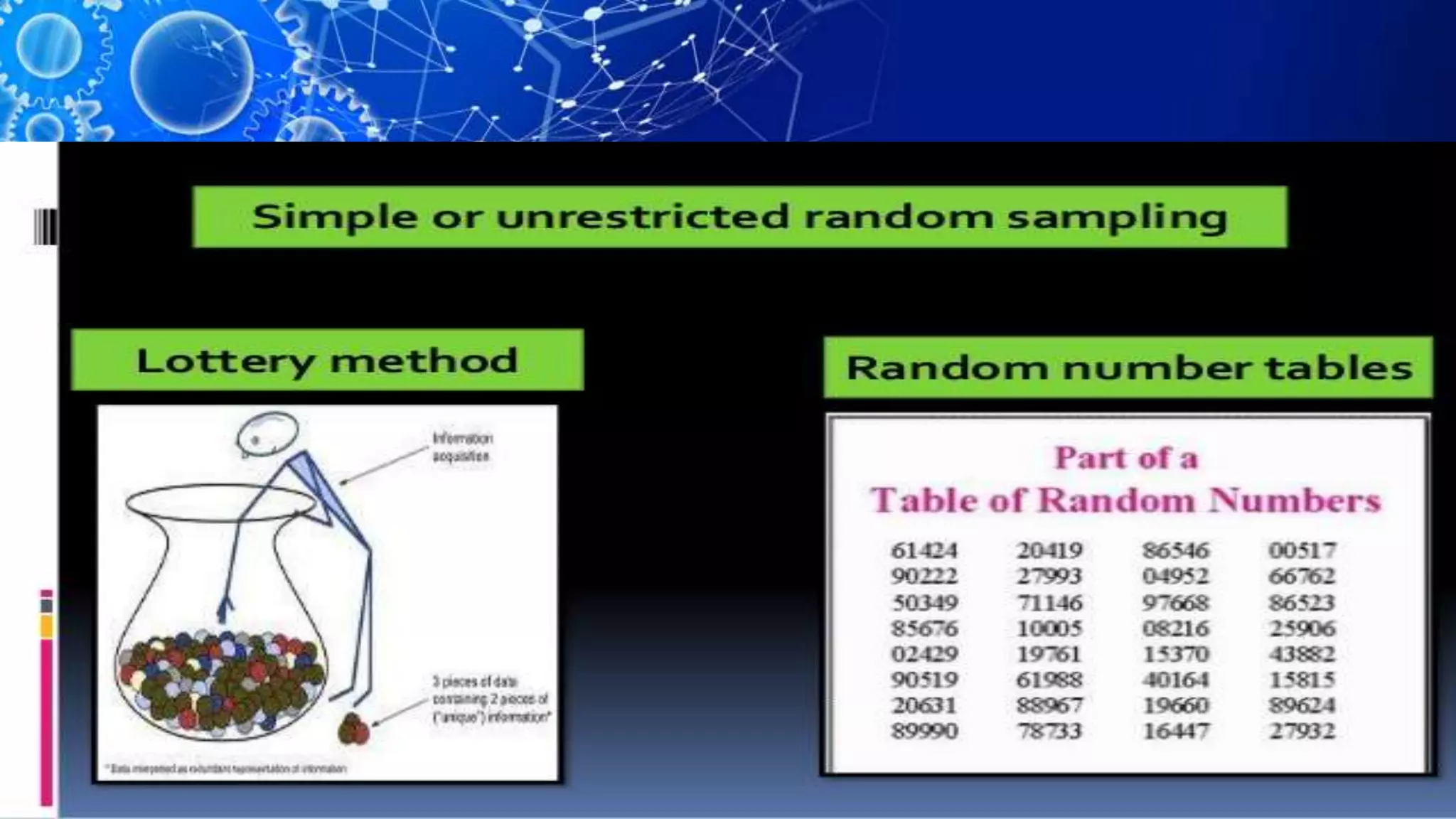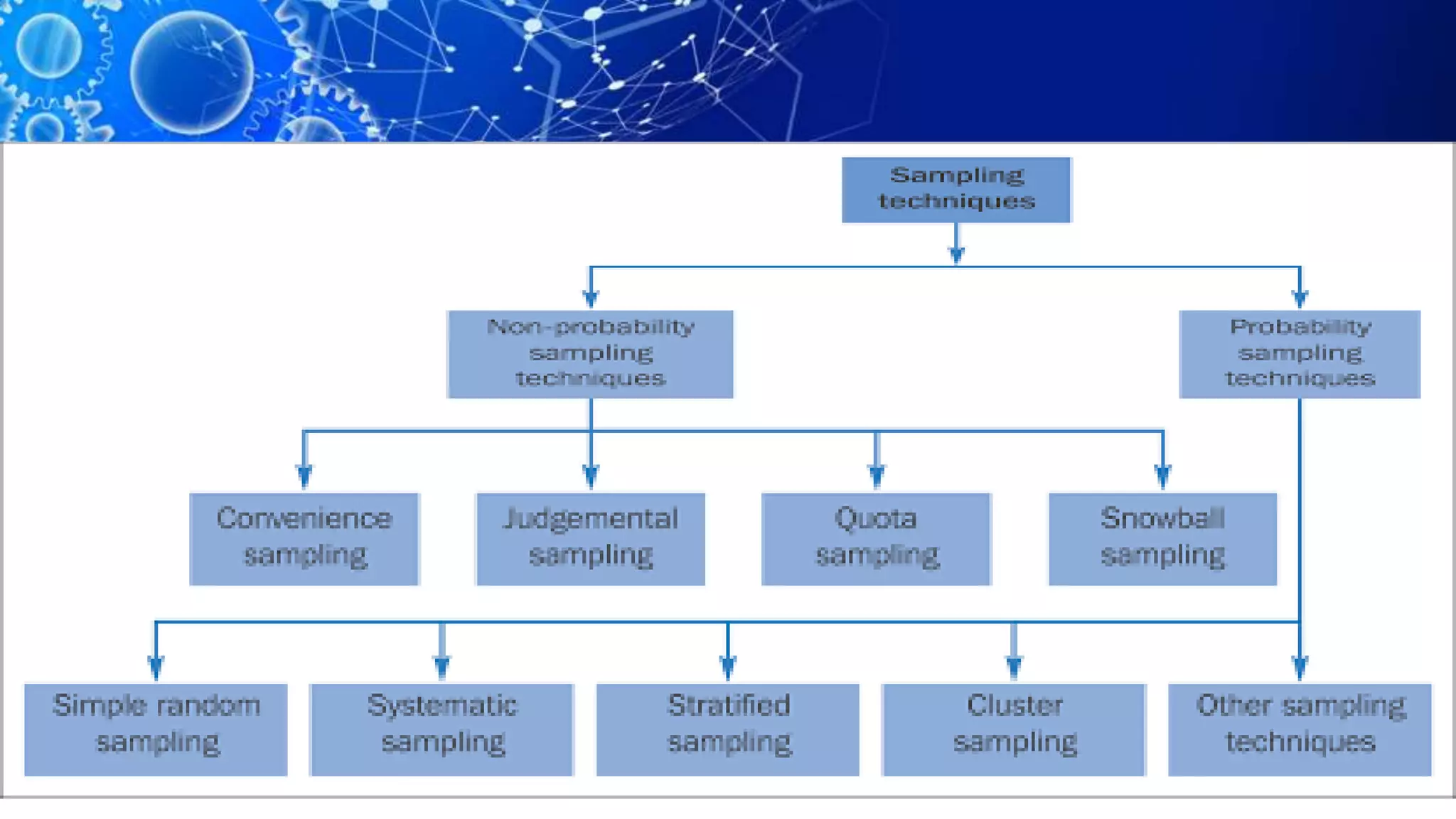 Sampling is the process of selecting a representative subset of a population for research purposes. There are two main types of sampling: probability sampling and non-probability sampling. Probability sampling uses random selection to give every member of the population an equal chance of being selected, reducing bias. Common probability sampling techniques include simple random sampling, stratified random sampling, and cluster sampling. Non-probability sampling does not use random selection and cannot accurately represent the entire population. Common non-probability techniques include convenience sampling, judgement sampling, quota sampling, and snowball sampling. The choice of sampling technique depends on factors like the size and nature of the population.