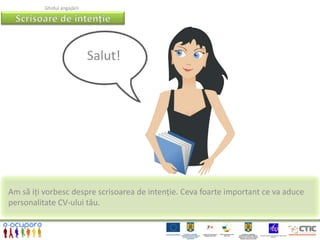 Documentul oferă un ghid detaliat despre redactarea scrisorii de intenție, subliniind importanța personalizării acesteia pentru fiecare aplicație. Se discută despre structura ideală a scrisorii, inclusiv informațiile esențiale care trebuie incluse, cum ar fi datele tale, motivul aplicației și argumentele pentru potrivirea cu postul dorit. De asemenea, se menționează tipurile de scrisori și când ar trebui să fie utilizate, cum ar fi scrisorile de răspuns la oferte de muncă și actualizări de CV.