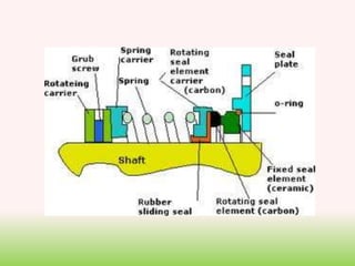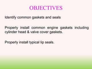 Seals and gaskets are used to prevent leaks and confine fluids like oil, water, gas and exhaust. Common gasket materials include cork-rubber, synthetic rubber and embossed steel. Leaks can occur if gaskets or seals are worn, parts are bent, fasteners are too loose or tight, or gaskets are installed improperly. Proper installation of gaskets and seals requires cleaning surfaces, checking for fit, and tightening correctly in steps according to specifications to prevent future leaks.