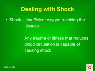 This document provides information on treating shock in children. It defines shock as insufficient oxygen reaching the tissues, which can be caused by trauma or illness reducing blood circulation. Signs of increasing shock severity are listed, from pale skin to loss of consciousness. The main causes of shock in children are serious bleeding, severe burns or scalds. Treatment aims to recognize shock, treat the cause, improve blood flow to vital organs, and remove the child to the hospital urgently. Steps for treatment include laying the child flat with legs raised, loosening tight clothing, covering with a blanket but not applying direct heat, reassuring and monitoring the child, and being prepared to provide rescue breathing if they lose consciousness.
