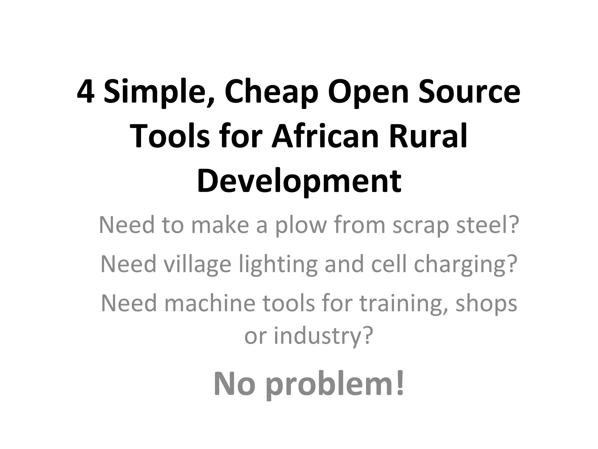 The document outlines four open-source tools designed for African rural development, which can be built from scrap materials: a drill, a multimachine, a genny for generating power, and a cement lathe. Each tool has unique applications, such as farming, training, and powering village needs, enabling communities to create machine shops or small factories. Detailed instructions and modifications are provided for building these tools affordably and effectively.