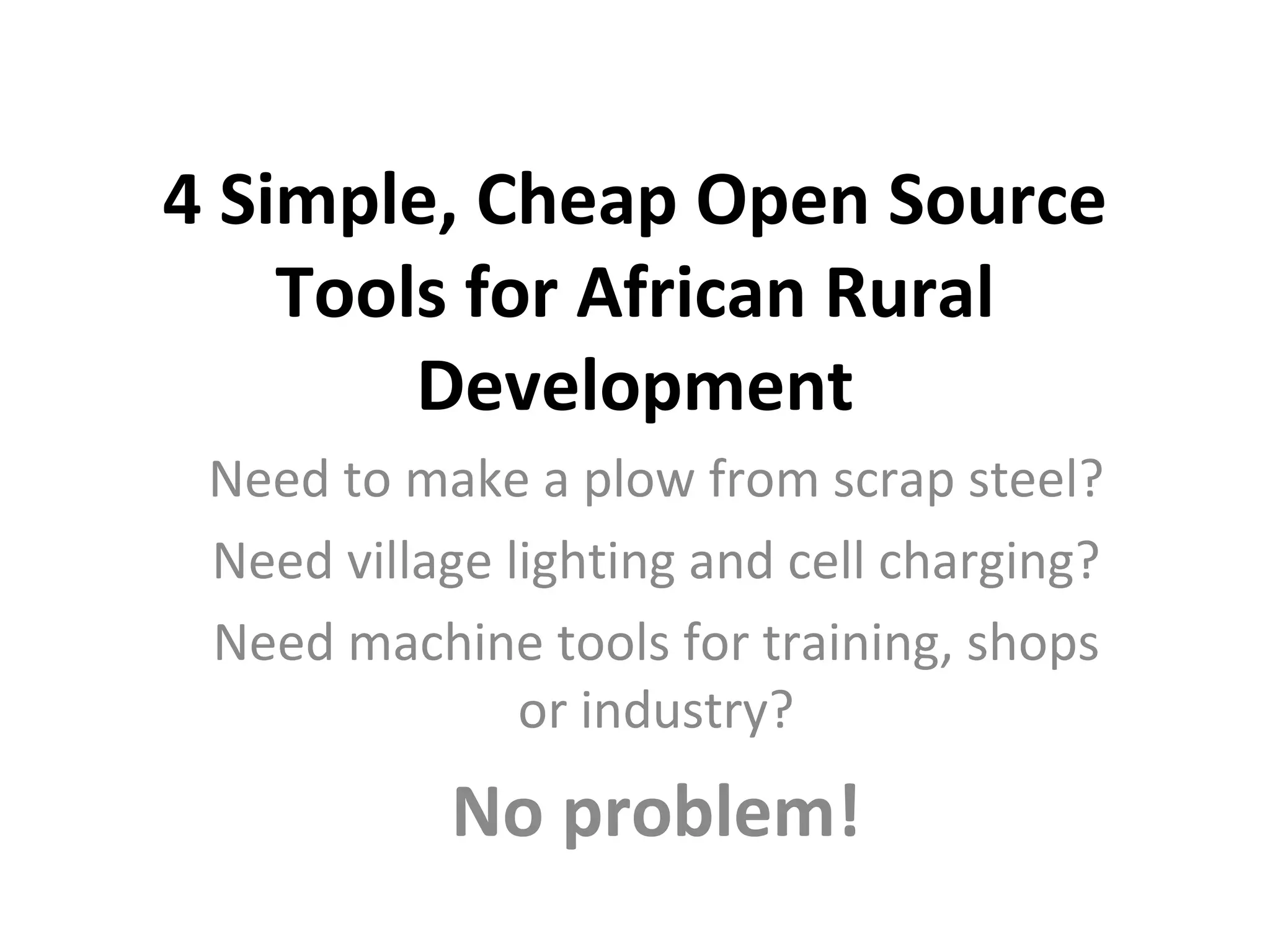 The document discusses four open-source tools designed for rural development in Africa: a drill, a multimachine, a genny, and a concrete lathe, all of which can be constructed from scrap materials. These machines enable a range of functions from metalworking to power generation for local communities. They promote sustainable practices by using available resources and are cost-effective to produce.