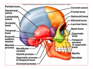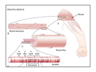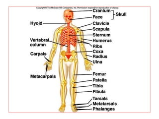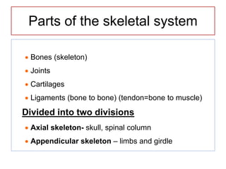 The skeletal system consists of bones, cartilage, joints and ligaments that work together to support the body, protect organs and allow for movement. There are two types of ossification that can form bone - intramembranous, where bone develops in connective tissue, and endochondral, where bone replaces cartilage. Bones are constantly remodeled through the actions of osteoblasts which build bone and osteoclasts which break it down. Factors like nutrition, hormones, exercise and aging can impact bone remodeling and strength over time.