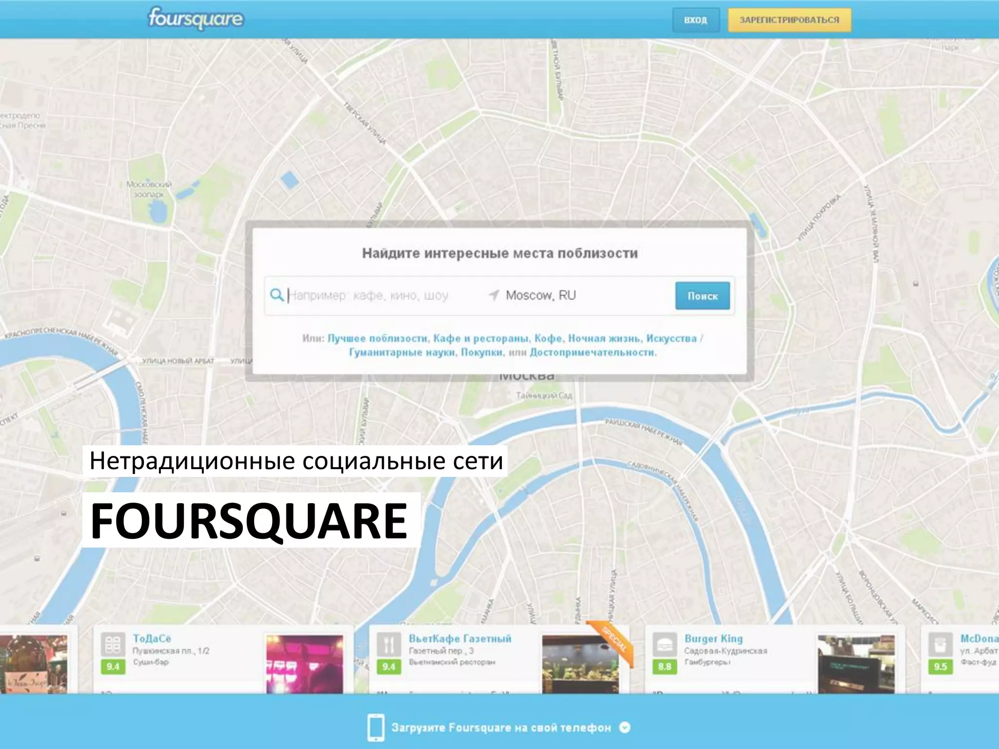Документ описывает возможности для брендов в нетрадиционных социальных сетях, таких как Foursquare, Instagram и Pinterest. В нем рассматриваются различные стратегии, включая размещение информации о магазинах, проведение конкурсов и создание контента для привлечения аудитории. Также предоставлены полезные ссылки для дальнейшего изучения и примеры успешного использования этих платформ.