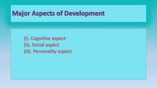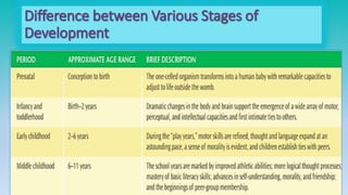 The document discusses lifespan development from various perspectives. It defines lifespan development as lifelong, multidimensional, and influenced by biological, cognitive, social, and contextual factors. It outlines Piaget's stages of cognitive development and how socialization is reciprocal between parents and children. Personality develops from temperament, attachments, and changes across life stages according to Freud, Erikson, and theories of temperament. Development involves growth, maintenance, and losses across the entire lifespan.