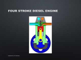 The document describes the four strokes of a diesel engine: intake, compression, power, and exhaust. In the intake stroke, air enters the cylinder as the piston moves down. In the compression stroke, both valves remain closed and the piston compresses the air. In the power stroke, fuel is injected and ignites when the piston reaches top dead center, pushing the piston back down. Finally, in the exhaust stroke, the exhaust valve opens and waste gases are expelled as the piston moves back up. The document also lists key engine components like the head, camshaft, piston, connecting rod, and crankshaft.