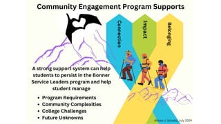 The document outlines the Bonner Student Development program, emphasizing the importance of education and training in fostering skills and community engagement among students. It highlights key frameworks, meeting planning strategies, and the positive impact of the program on students' educational and personal development. Key factors for success include mentorship, diversity, and structured reflection, all contributing to retention and graduation rates, especially for disadvantaged student populations.