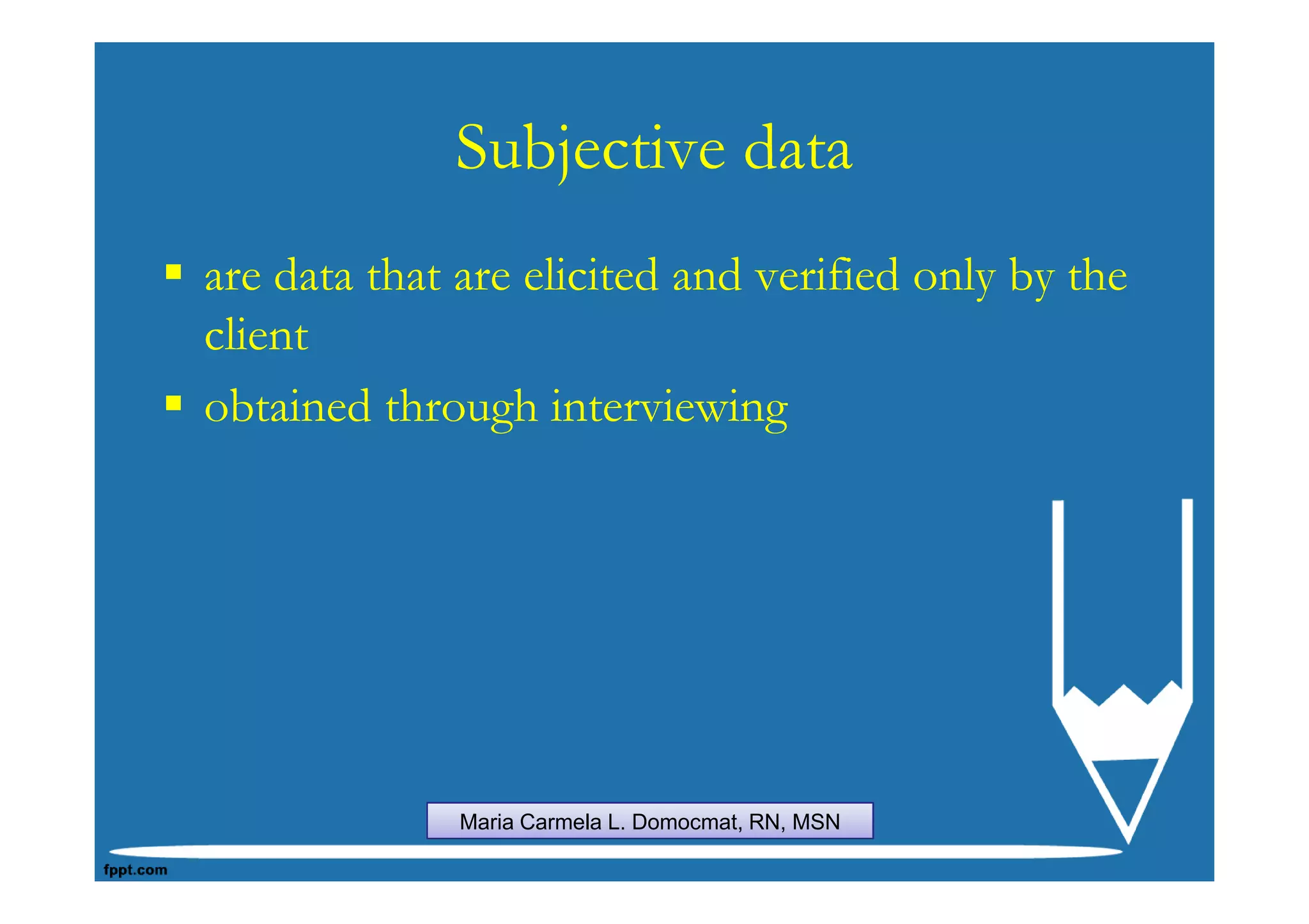Social data • includefamily relationships, ethnic and educational background, economic status, home and neighborhood conditions. Maria Carmela L. Domocmat, RN, MSN