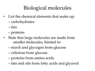 This document outlines statements from the Cambridge IGCSE Chemistry syllabus regarding biological molecules. It describes the chemical elements that make up carbohydrates, fats, and proteins. It also discusses how large biomolecules are formed from smaller molecules, such as starch from glucose or proteins from amino acids. Several chemical tests are listed that can identify biomolecules like starch, sugars, proteins, and fats. The roles of protein shape and structure in enzyme function and antibody binding are touched on. Water is described as an important solvent in organisms, aiding in digestion, excretion, and transport. Finally, the structure of DNA is summarized as a double helix with paired nucleotide bases.
